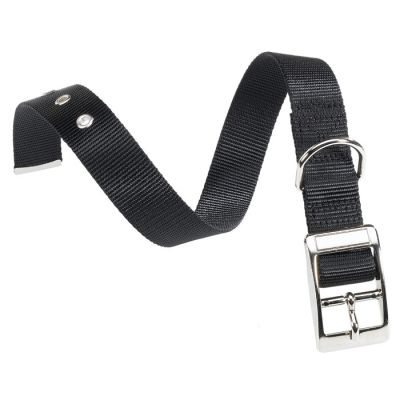 Περιλαίμιο σε μαύρο χρώμα, για σκύλους. Είναι κατασκευασμένο από ιμάντα υψηλής αντοχής που εγγυάται ένα ασφαλές αλλά ποτέ ενοχλητικό κράτημα για τον σκύλο, ενώ η χρωμιωμένη μεταλλική αγκράφα επιτρέπει ένα αποτελεσματικό κλείσιμο, δίνοντας ταυτόχρονα μια πινελιά κομψότητας.
