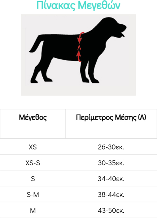 Για να επιλέξετε το σωστό μέγεθος, μετρήστε την Περίμετρο Μέσης του σκύλου σας, όπως φαίνεται στη φωτογραφία (Α)