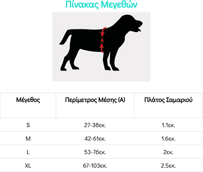 Για να επιλέξετε το σωστό μέγεθος, μετρήστε την Περίμετρο Μέσης του σκύλου σας, όπως φαίνεται στη φωτογραφία (Α)