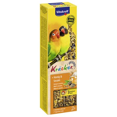 Τραγανά κράκερ με μέλι και σουσάμι, για μεσαίου μεγέθους παπαγάλους. Ψήνονται σε φυσικό ξύλο για μεγάλη διάρκεια και απασχόληση. Περιέχουν μέλι και δημητριακά, που προσφέρουν ενέργεια και ποικιλία στη διατροφή, και βοηθούν στη φυσική φθορά του ράμφους. Η συσκευασία περιέχει 2 κράκερ.